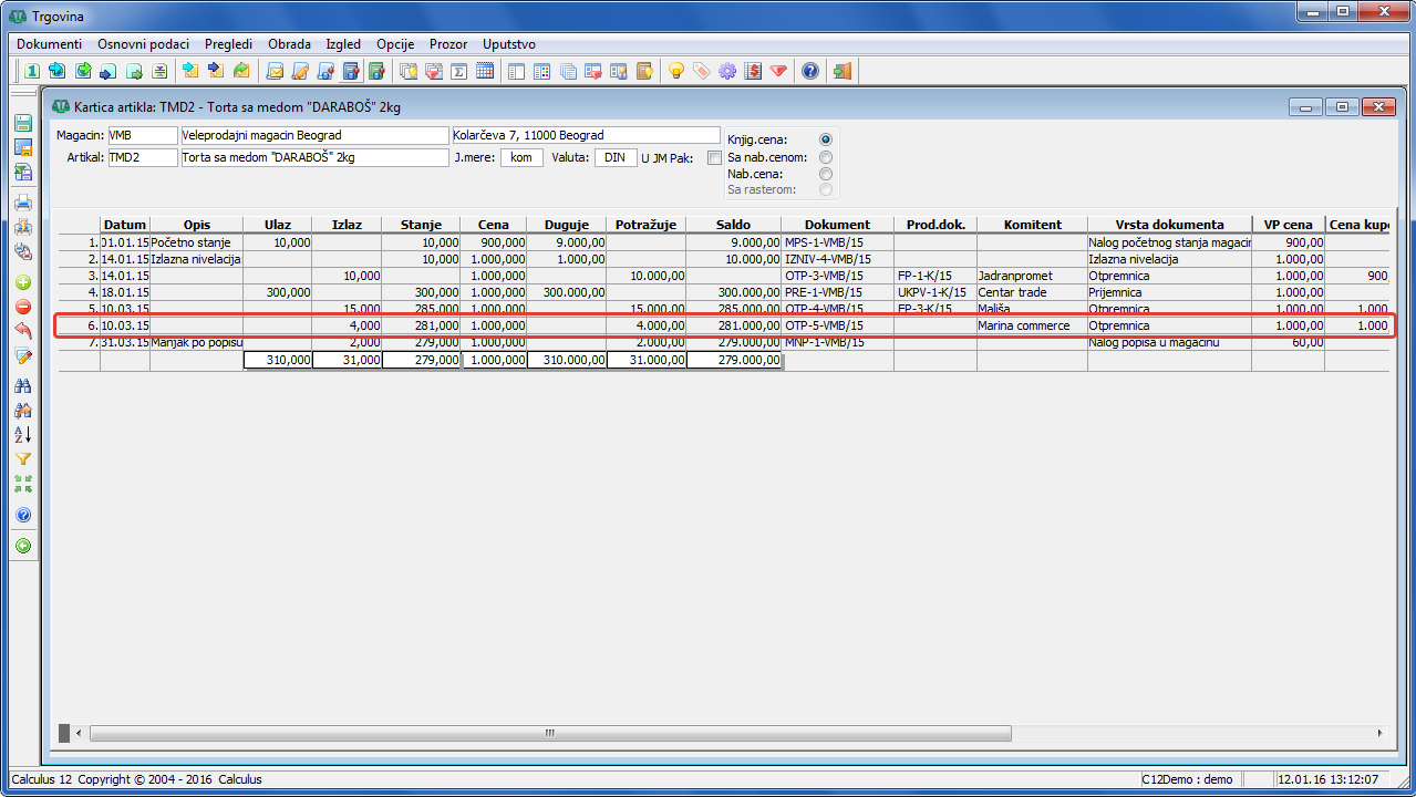 Pregledi - kartice (kartica robe) - promena se prikazuje na kartici svakog artikla koji se nalazi u otpremnici. (vidi sliku)
