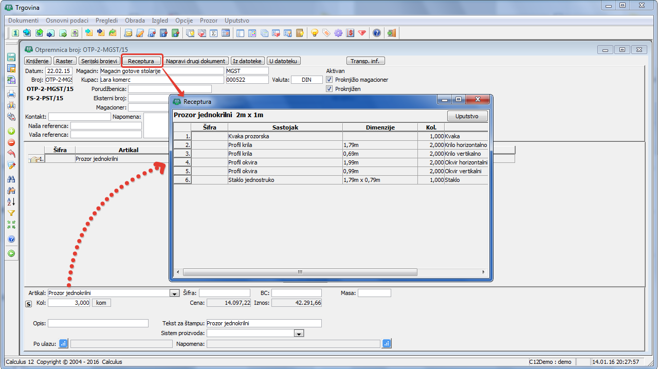 Klikom na dugme "Receptura" otvara se prozor sa stavkama recepture (sastavnice) gotovog proizvoda (vidi sliku)