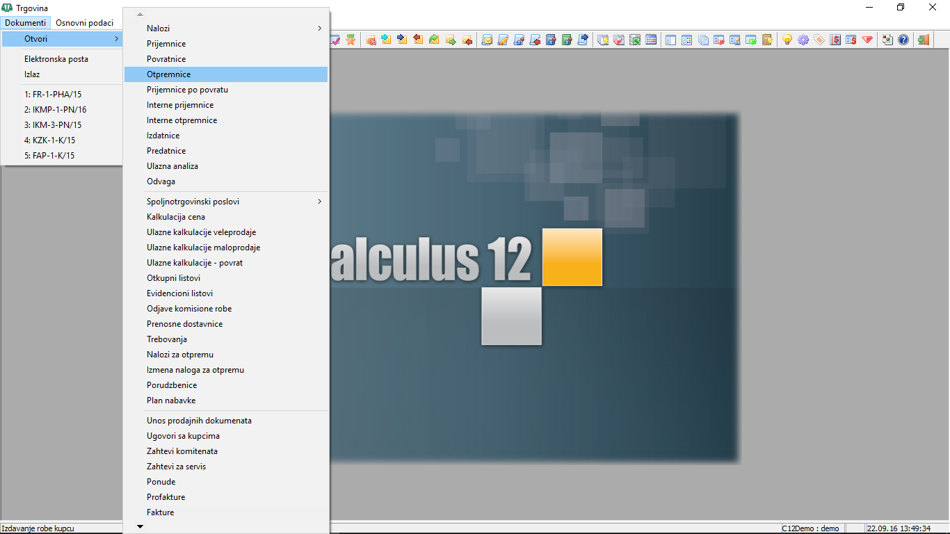 Da otvorite prozor "Dokumenti - Otpremnice" u glavnom meniju programa "Trgovina" odaberite stavku "Dokumenti - Otvori - Otpremnice" ( vidi sliku ) ili kliknite na ikonu osnovnog menija "Otpremnice"