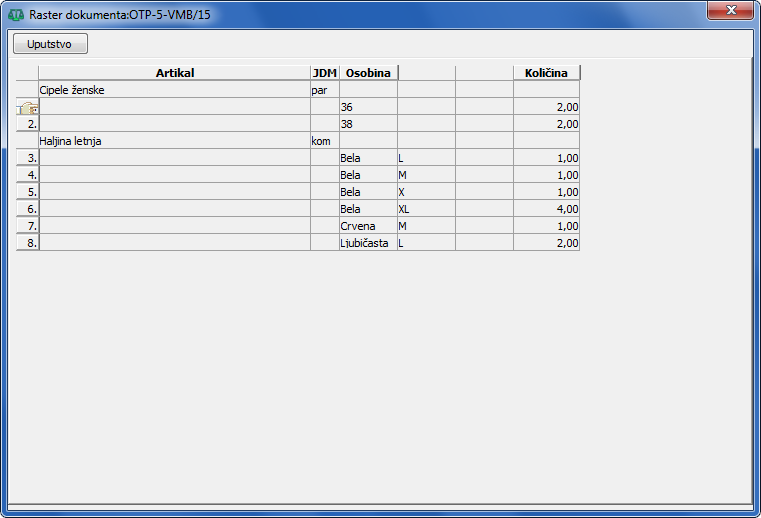 Prozor za linijski unos rastera (dodatnih osobina artikla). Otvara se iz stavki bilo kojeg magacinskog dokumenta. Npr. U demo bazi otvori raster za cipele - prikazuje samo veličinu (vidi sliku) Linijski raster..
