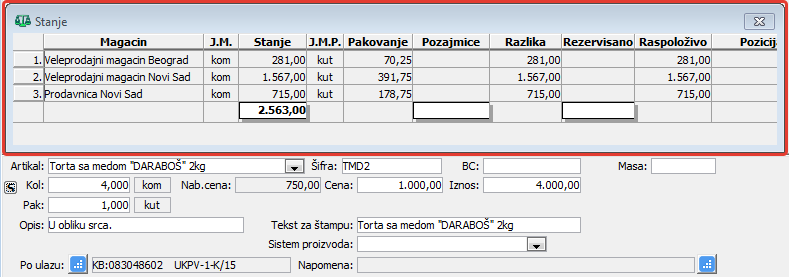 U stavkama otpremnice kao i ostalim prodajnim dokumentima klikom na dugme "Stanje" dobija se pregled stanja po magacinima sa i bez rezervacija (vidi sliku)