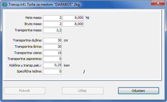 Klikom na dugme "Transportne informacije" otvara se prozor za pregled transportnih informacija artikala (vidi sliku) Pregled transportnih informacija za artikal..