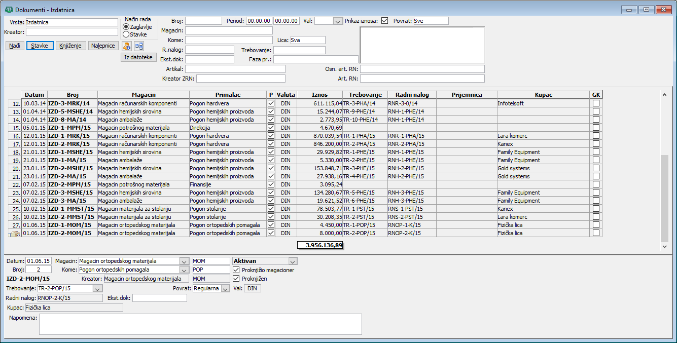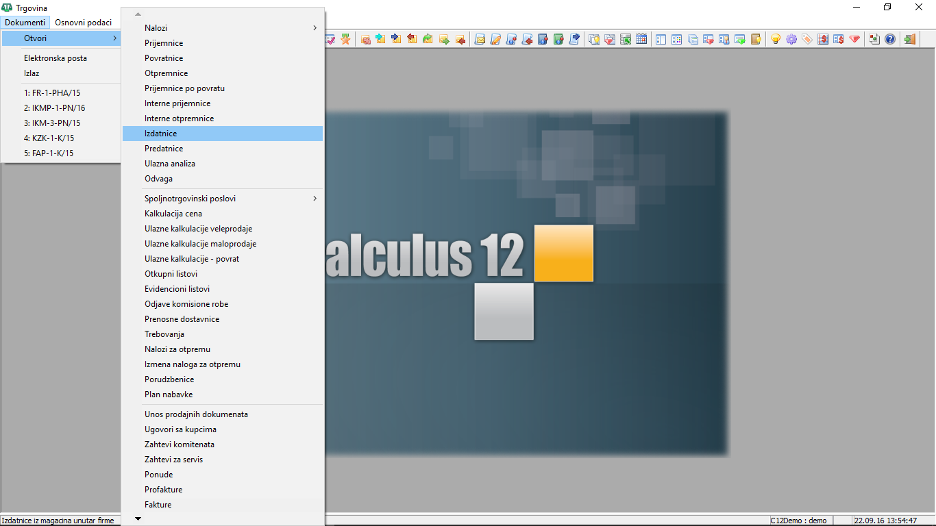 Da otvorite prozor "Dokumenti - Izdatnica" u glavnom meniju programa "Trgovina" odaberite stavku "Dokumenti - Otvori - Izdatnice" ( vidi sliku ) ili kliknite na ikonu osnovnog menija "Izdatnice"