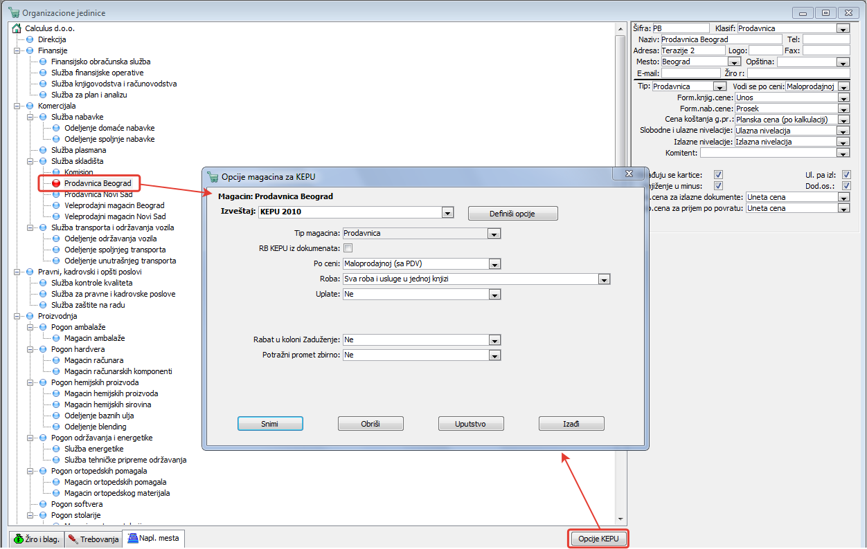 Organizaciona jedinica (prodajni objekat). Program prikazuje dokumente iz svih magacina koji su podređeni navedenoj organizacionoj jedinici. Ovim je omogućeno da unutar jednog objekta definišete više logičkih magacina, a da KEPU izlistate za sve zajedno. Svi magacini unutar izabrane org. jedinice moraju imati jednako definisano vođenje cena, inače nećete moći da izlistate zajedničku KEPU knjigu.