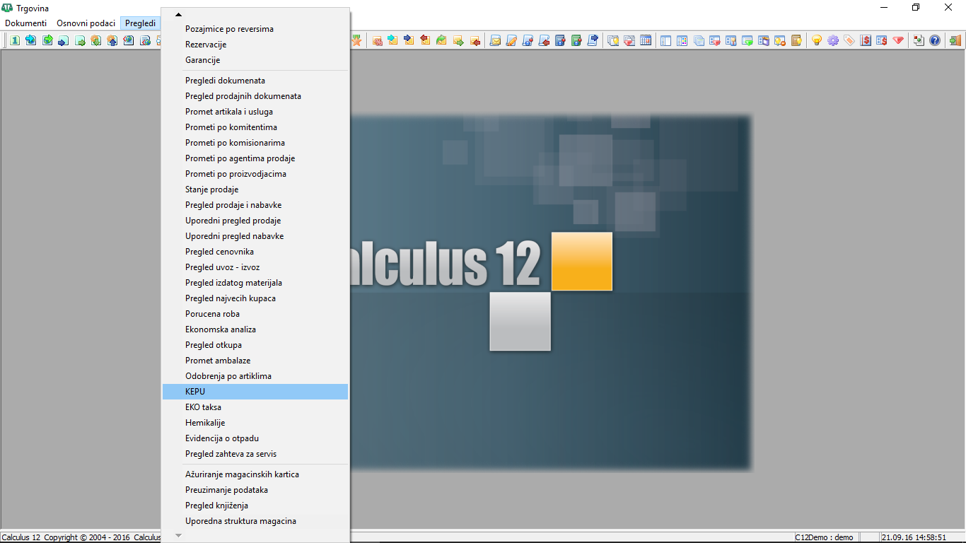 Da otvorite prozor "Pregledi - KEP" u glavnom meniju programa "Trgovina" odaberite stavku "Pregledi - KEP" ( vidi sliku )