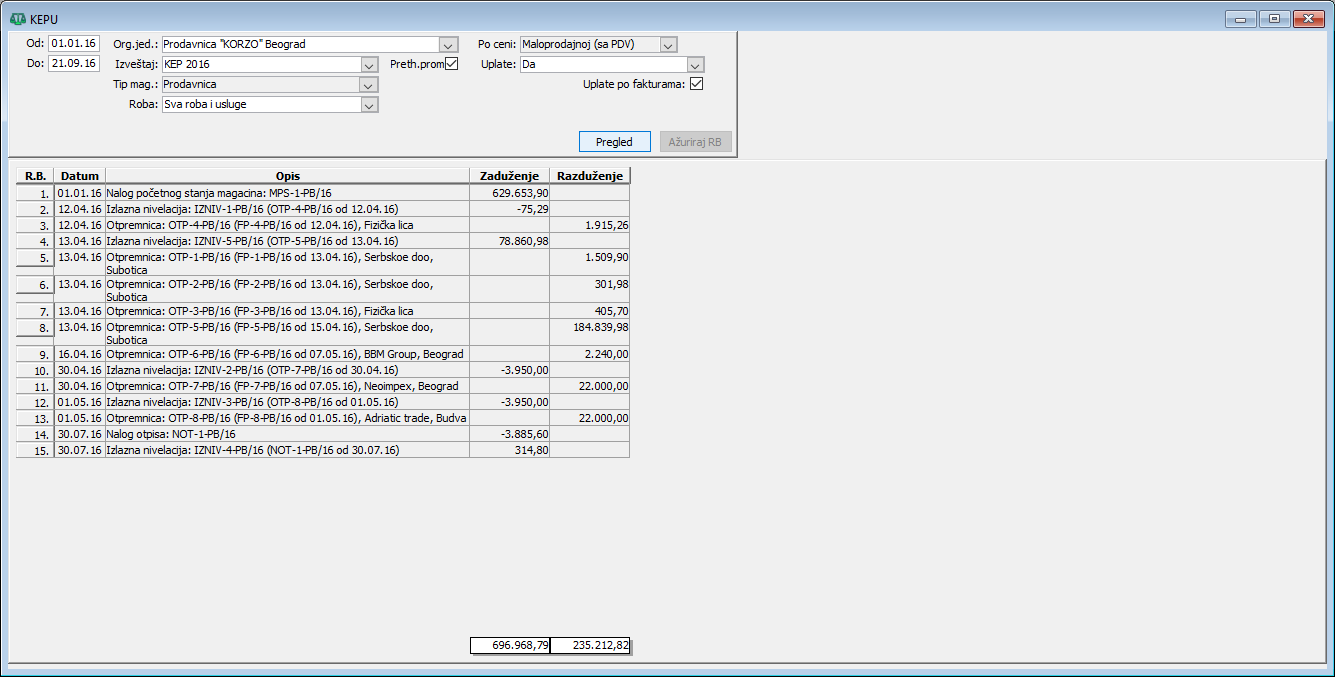 Period za koji se traži pregled. Ako treba da štampate KEPU, obavezno pozovite pregled od 01.01 tekuće poslovne godine, jer štampani obrazac KEPU zahteva ispravne brojeve stranica i numeraciju stavki. Ako želite da odštampate samo neke stranice, opseg stranica možete izabrati naknadno, u prozoru za štampanje.
