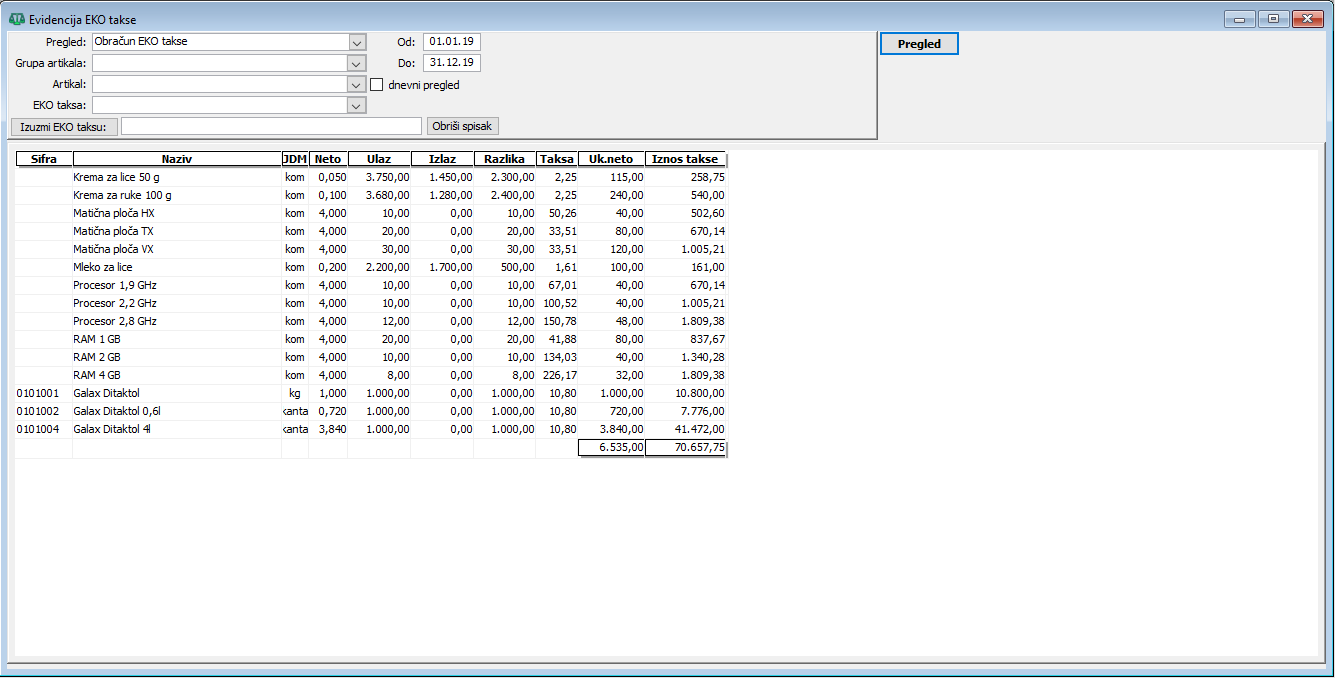Obračun i evidencija EKO taksa za uvezene i izvezene artikle".