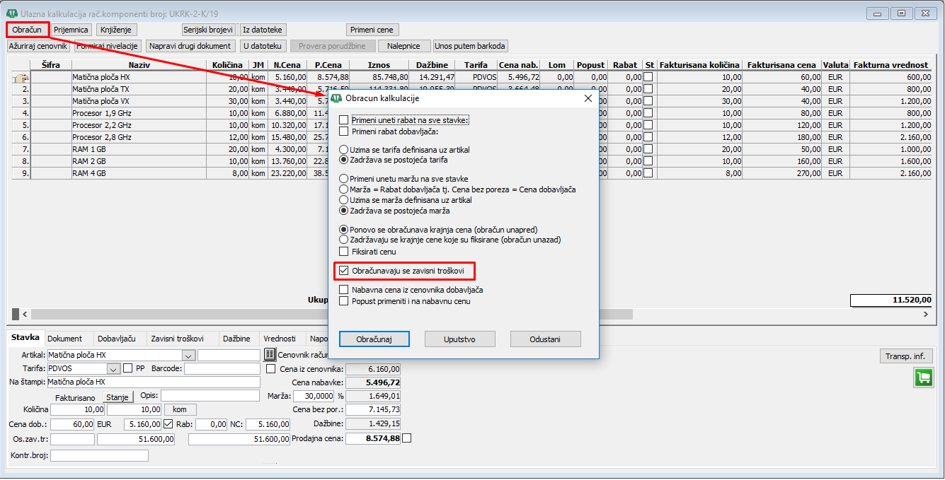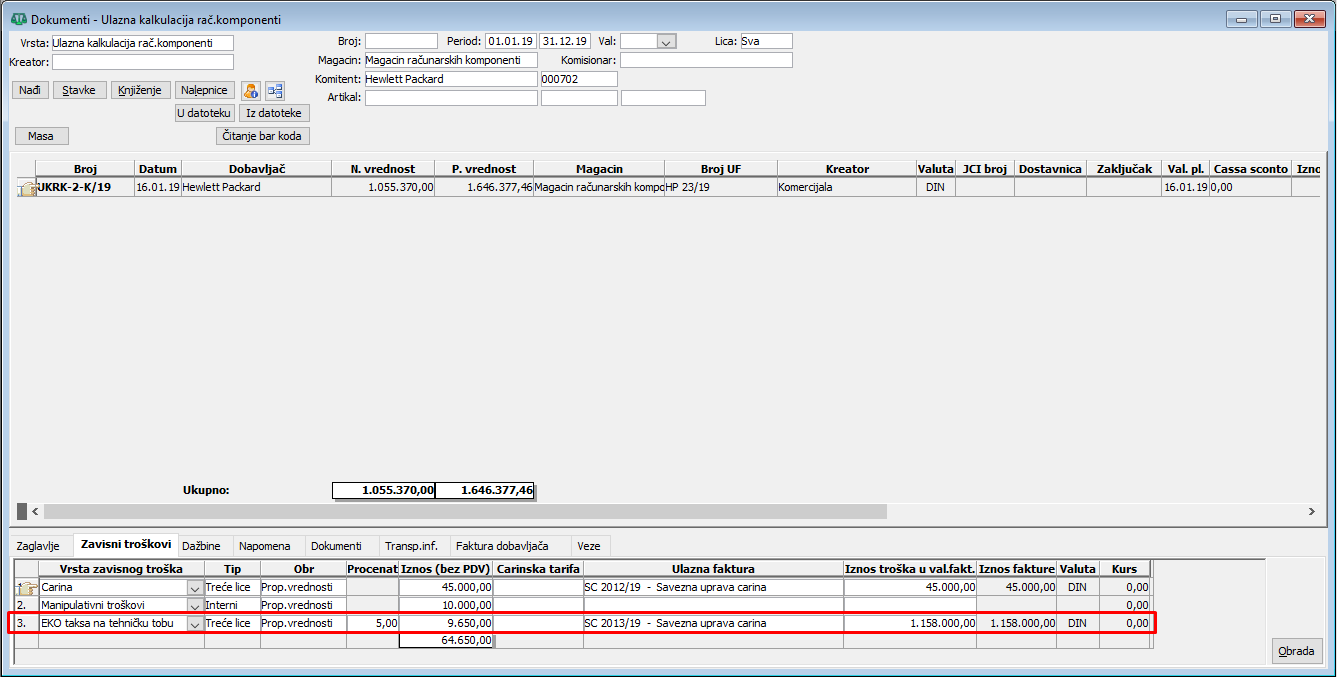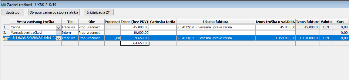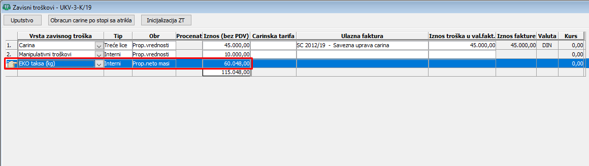 Nakon ovoga treba u stavkama UK obavezno startovati obračun radi rasporeda zavisnih troškova. Prilikom puštanja obračuna zavisnog troška po stavkama, prirodno je da u koloni "Obr" bude uneto "Prop.vrednosti". Ovaj zavisni trošak će se pri obračunu rasporediti samo na stavke čiji artikli imaju definisanu eko taksu koja je navedena u koloni "eko taksa" u definiciji vrste zavisnog troška, (vidi sliku)