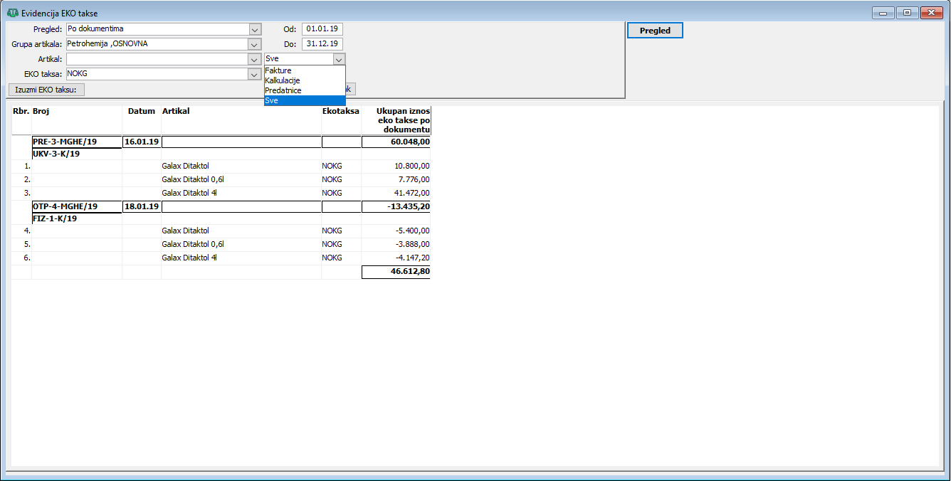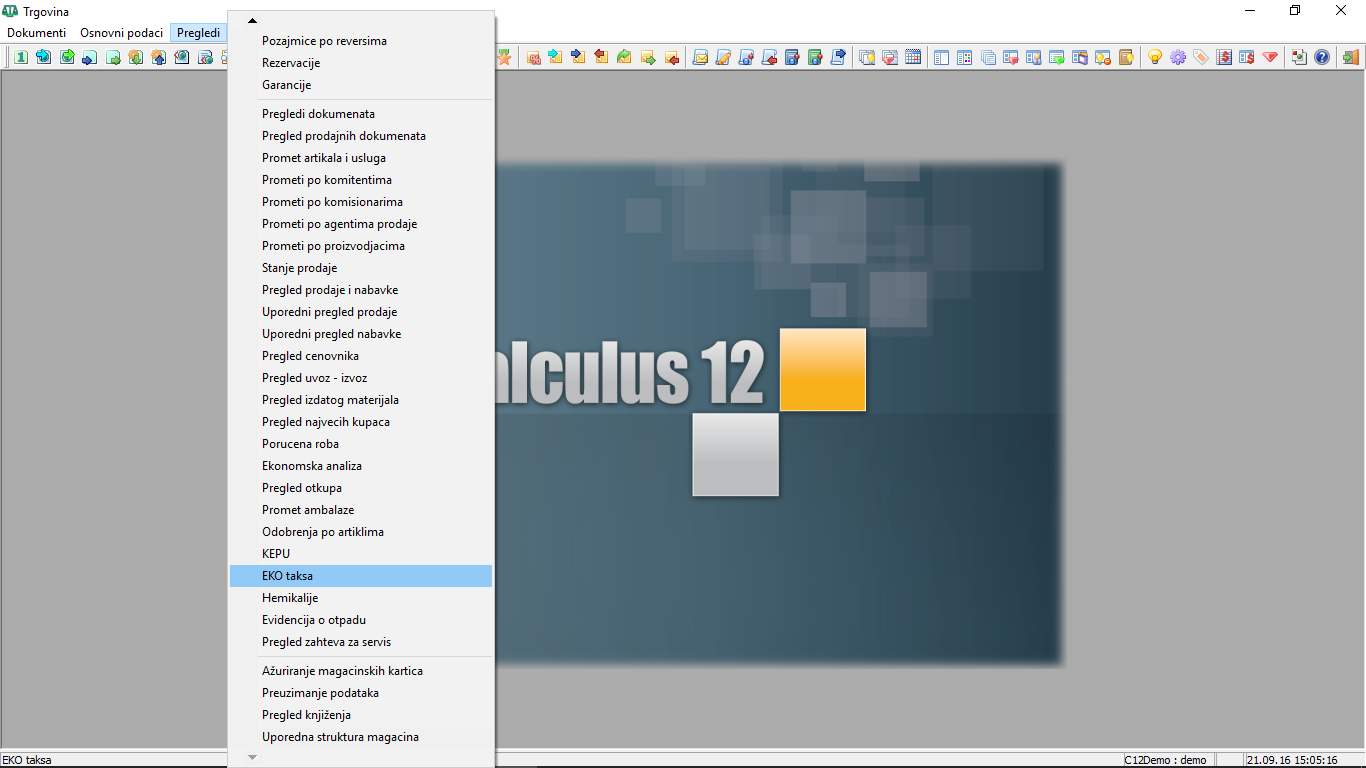 Da otvorite prozor "Pregledi - EKO taksa" u glavnom meniju programa "Trgovina" odaberite stavku "Pregledi - EKO taksa" ( vidi sliku )