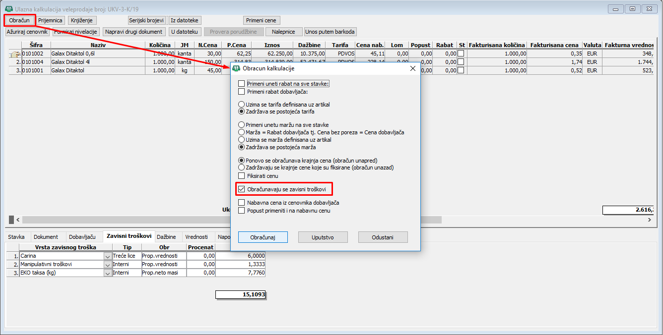 Iznos zavisnog troška se u stavkama ulazne kalkulacije automatski izračunava na osnovu količine artikla i jediničnog iznosa naknade EKO takse. Nakon ovoga treba obavezno startovati opciju obračun radi rasporeda zavisnih troškova, (vidi sliku)