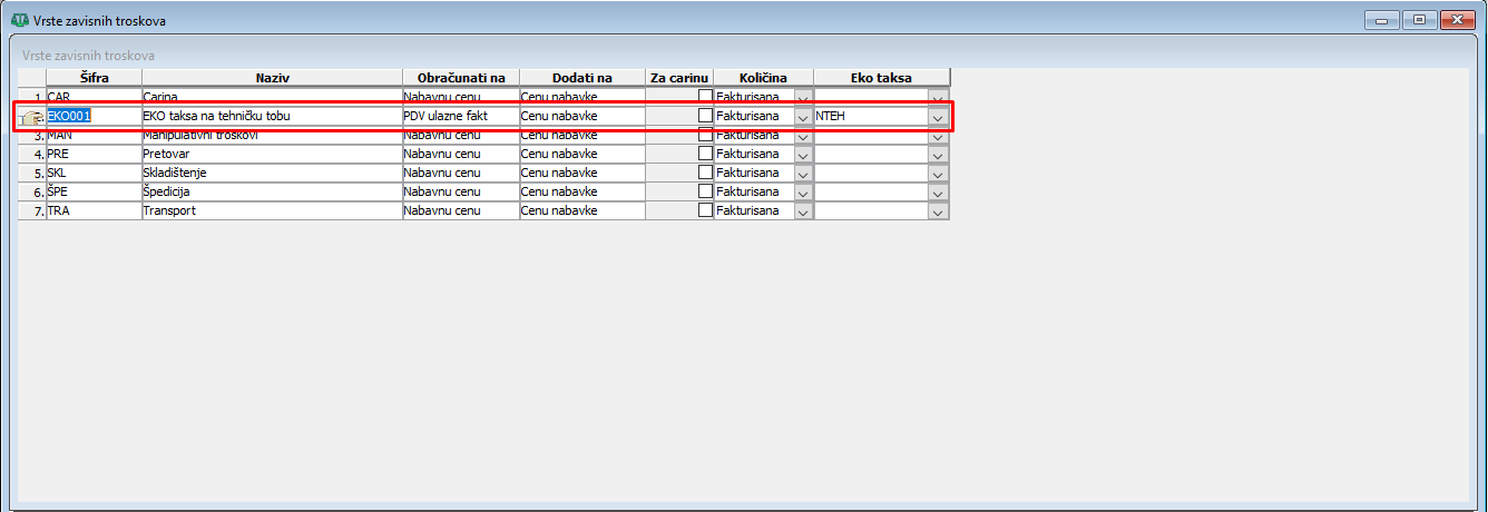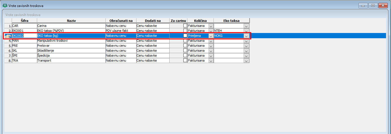EKO taksu na artikle za koje se prilikom uvoza obračunava po NETO kilogramu artikla treba obračunati kao zavisni trošak nabavke. Da biste EKO taksu uključili u zavisne troškove nabavke neophodno je da u dažbinama definišete odgovarajuću EKO taksu. U dažbinama, jedinični iznos naknade Eko takse unesite u kolonu "Fiksni iznos a za jedinicu mere "JM" unesite "kg", (vidi sliku)