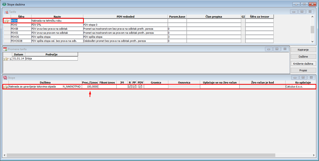 U dažbinama, stopu Eko takse postavite na procenat 100 što predstavlja 100% od zavisnog troška. Polje za "JM" mora biti prazno polje jer se eko taksa ne vezuje za jedinicu mere, (vidi sliku)