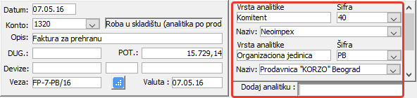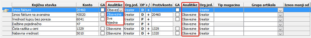 označava sve one podatke koji se koriste kod upoređivanja iznosa dokumenata u trgovini i njihovih iznosa proknjiženih u glavnu knjigu. Ako je npr. prikazan magacin kao analitika, a magacin proknjižen uz stavku glavne knjige ne odgovara magacinu u stavkama dokumenta, iznos će biti označen kao neodgovarajući, odnosno stavka glavne knjige neće biti "uparena" sa knjižnom stavkom dokumenta ( vidi sliku )