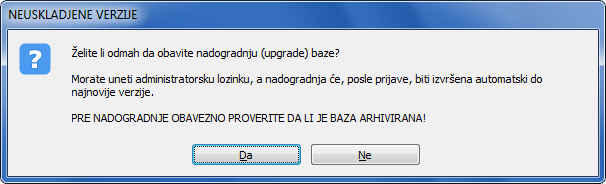 Program će vas samo obavestiti o tekućoj varijanti baze i programa i varijanti koju trebate instalirati da biste nastavili sa radom i ponuditi usklađivanje (vidi sliku)Važno