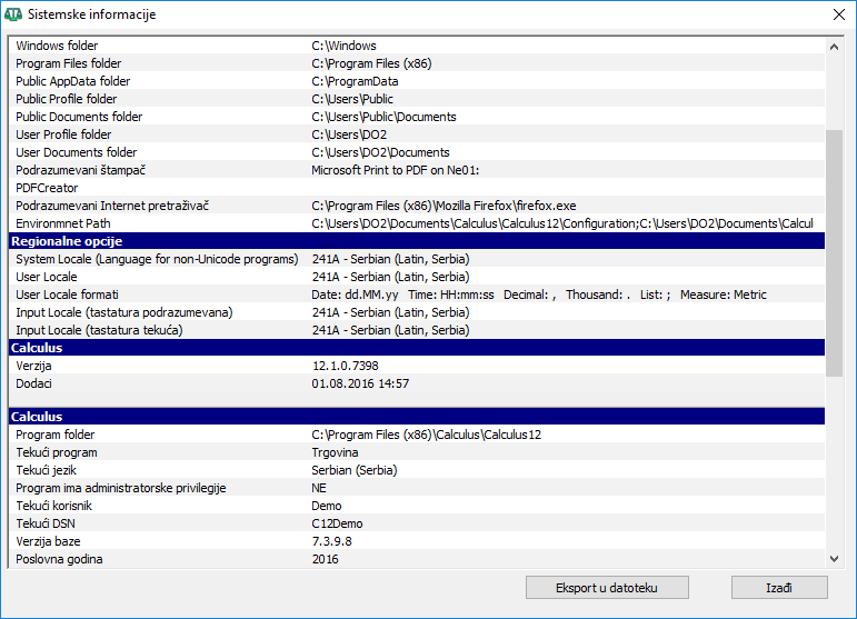 Vašu tekuću varijantu programa i baze možete pogledati iz bilo kojeg korisničkog programa, kroz opciju glavnog menija "Uputstvo - O programu". Tu je prikazana i tekuća poslovna godina za bazu nad kojom radite (vidi sliku)