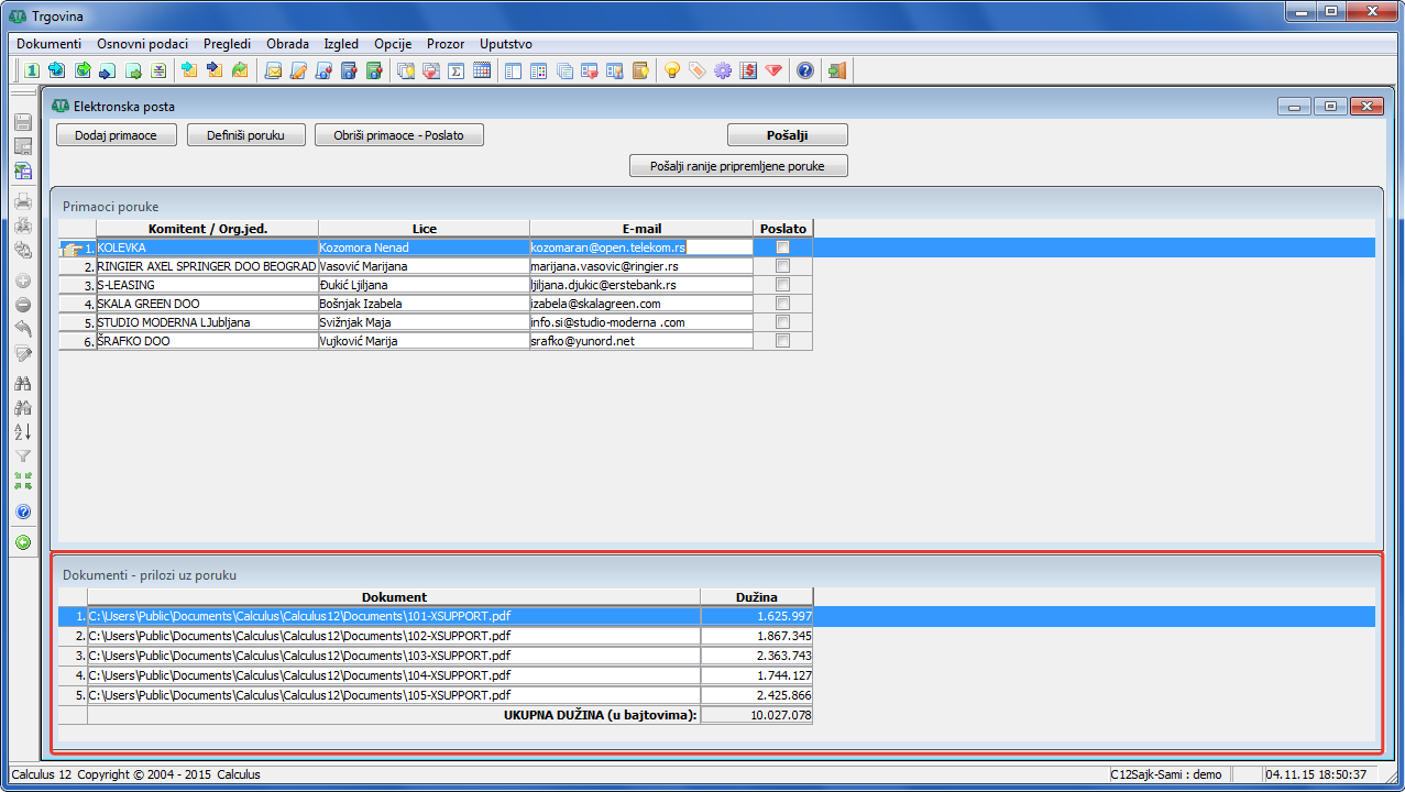 Izbor primalaca sa slanje e-pošte. U filteru ovog prozora u grupi dugmadi za potvrđivanje postavite filter za željeni skup podataka, zatim kliknite na dugme Pregled. Sada u podprozoru "Izbor" selektujte one komitente kojima šaljete poruku i/ili dokumenta. Kliknite na dugme Dodaj selektovane. U podprozoru "Izabrani primaoci" biće uneti svi selektovani komitenti. Ovu proceduru možete ponavljati sve dok u podprozor "Izabrani primaoci" ne budu uneti svi komitenti kojima ste namenili e-poruku. Sada kliknite na dugme Potvrdi. Svi izabrani komitenti pojaviće se u podprozoru "Primaoci poruke". Time ste odredili kome će sve biti poslata e-pošta.