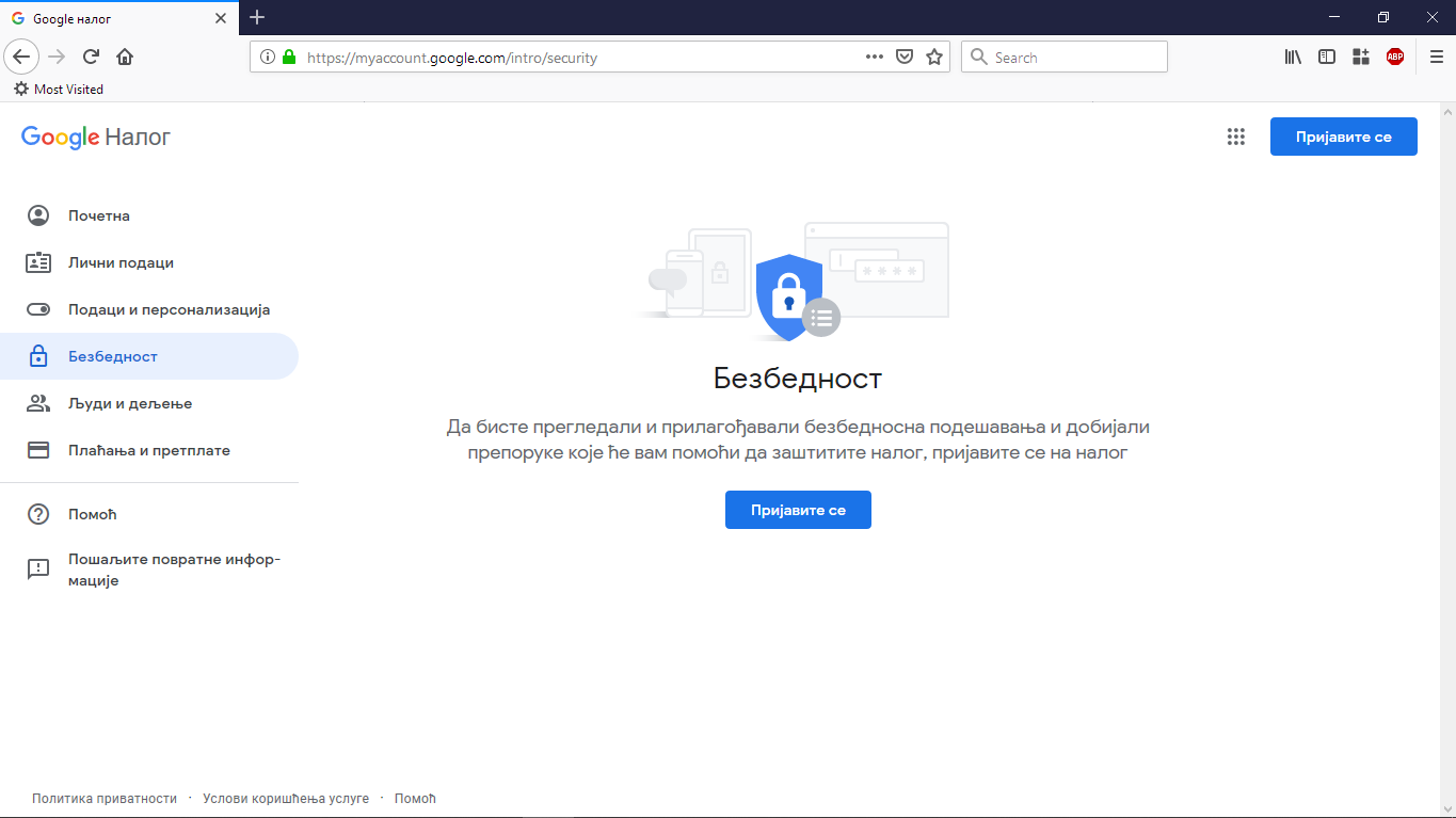 U levom meniju za navigaciju kliknite na "Bezbednost", (vidi sliku)