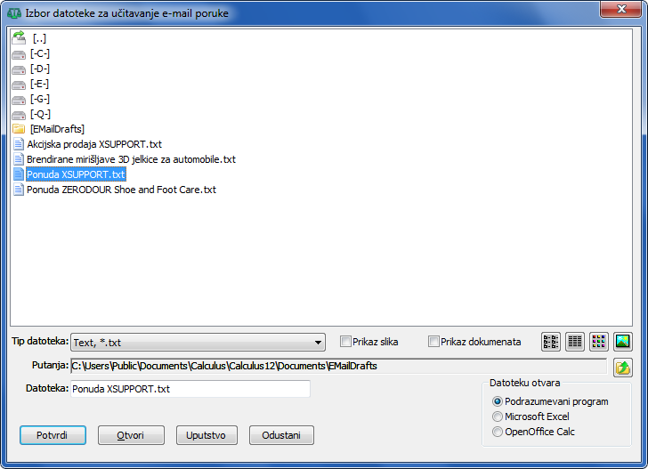 Slanje ranije pripremljene poruke. Izaberite datoteku sa e-porukom i kliknite na taster Potvrdi. E-poruka će biti prosleđena e-mail klijentu i odmah poslata. Više o ovom prozoru za izbor datoteka pročitajte u delu uputstva Izbor datoteka i direktorijuma za eksport podataka