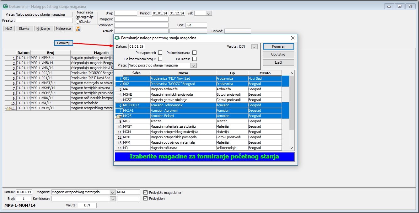 - U filteru prozora "Dokumenti - Nalog početnog stanja magacina" kliknite na dugme "Formiraj" da otvorite iskačući prozor "Formiranje naloga početnog stanja magacina".