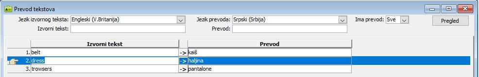 Ovaj prevod koristi se za sada u nekim specifičnim procedurama za uvoz podataka o artiklima, gde su npr. datoteke sa nazivima artikala na engleskom, pa nazive kod uvoza treba prevesti na srpski. U prozoru za prevod tekstova unose se prevodi često korišćenih reči ili fraza koje se pojavljuju u nazivima artikala, tako da procedura za uvoz može automatski da prevede delove naziva ili cele nazive, olakšavajući konačni prevod kompletnih naziva artikala.