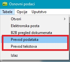 Do prozora za prevod teksta "Prevod teksta" dolazi se iz opcija glavnog menija programa "Osnovni podaci", na sledeći način "Tabele - Prevod teksta" ( vidi sliku )