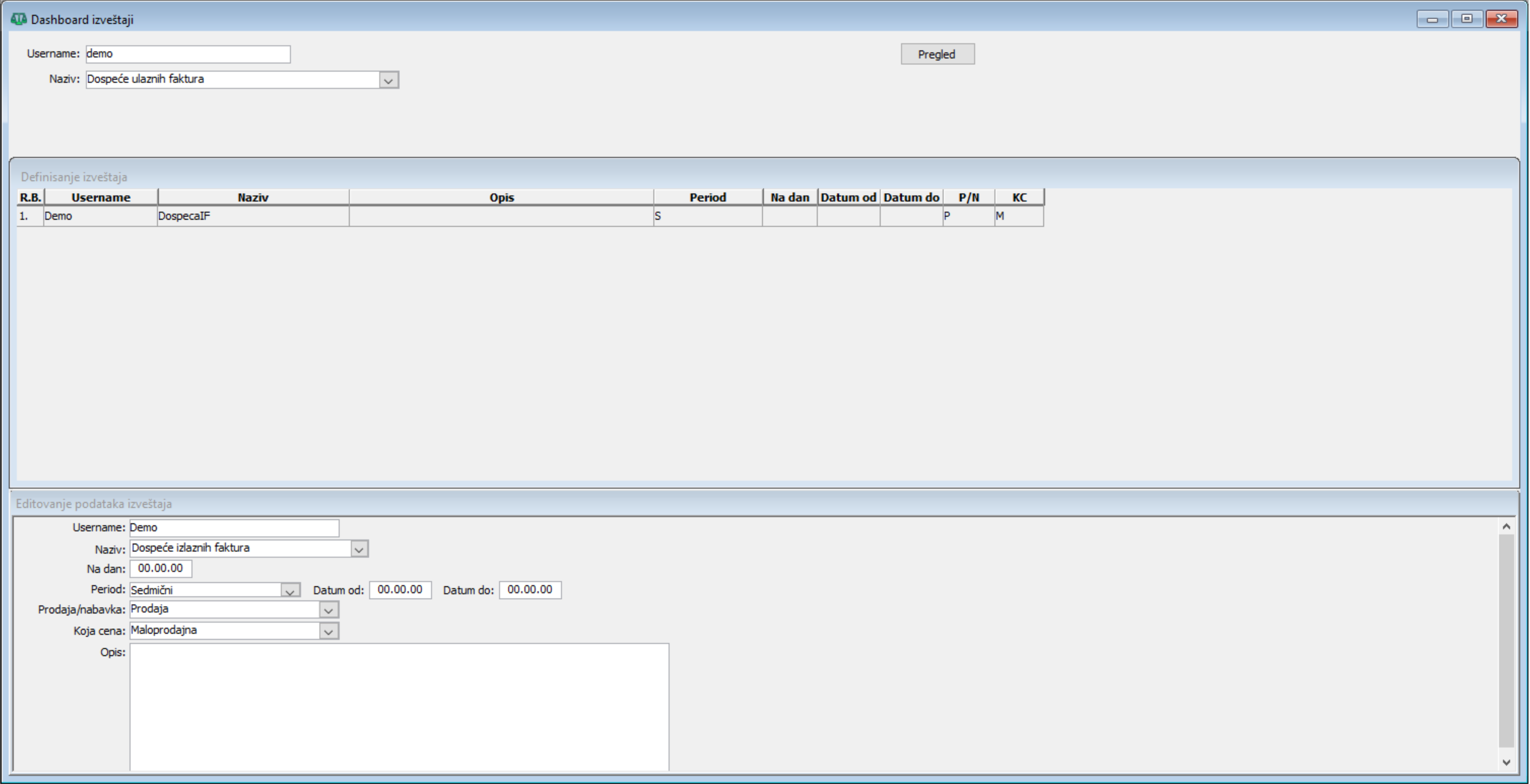 Prozor "Dashboard izveštaji - dospeće ulaznih faktura"