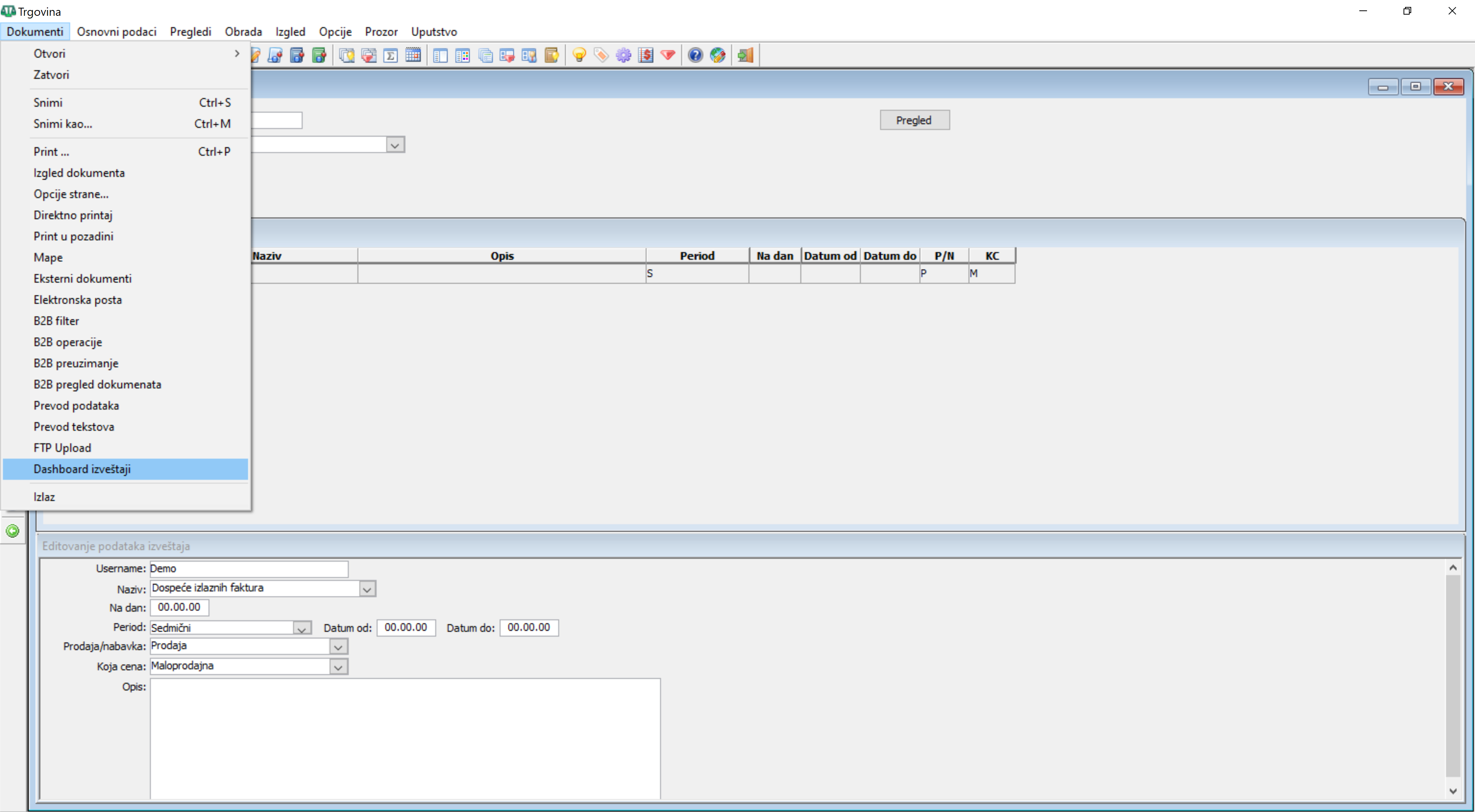 Prozor "Dashboard izveštaji - meni"