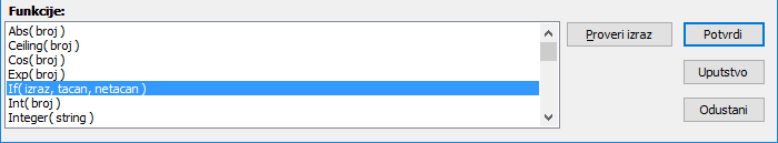 U listi "Funkcije" nalaze se ponuđene matematičke i druge funkcije koje se mogu koristiti u izrazima ( vidi sliku )