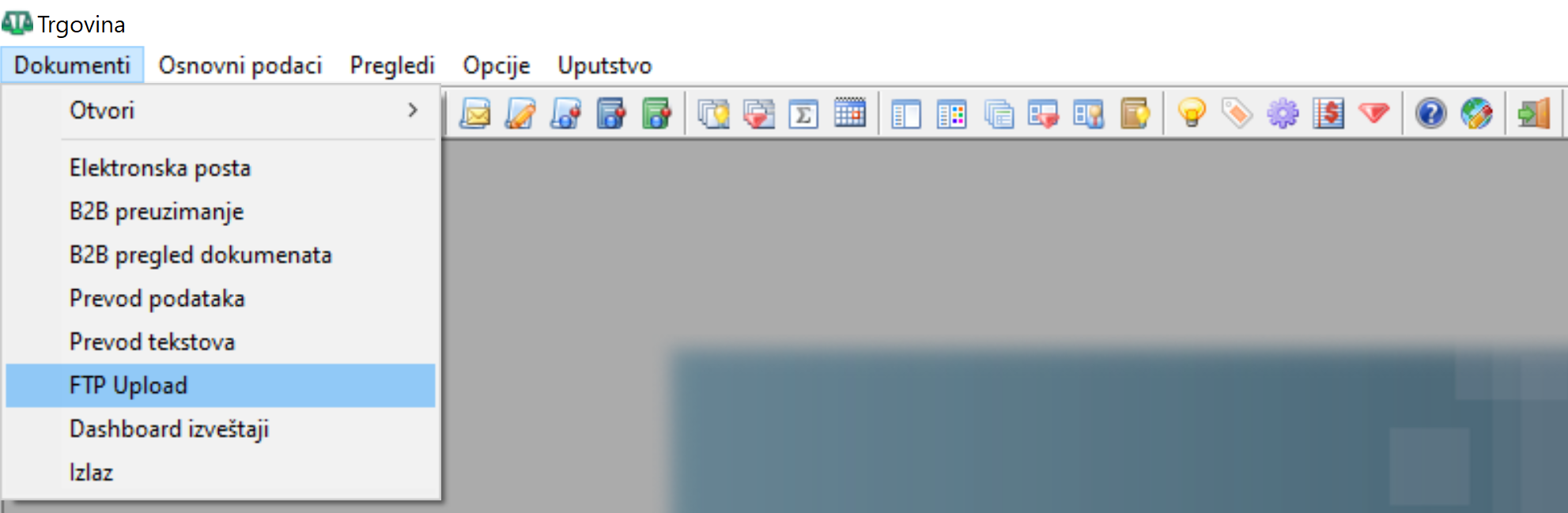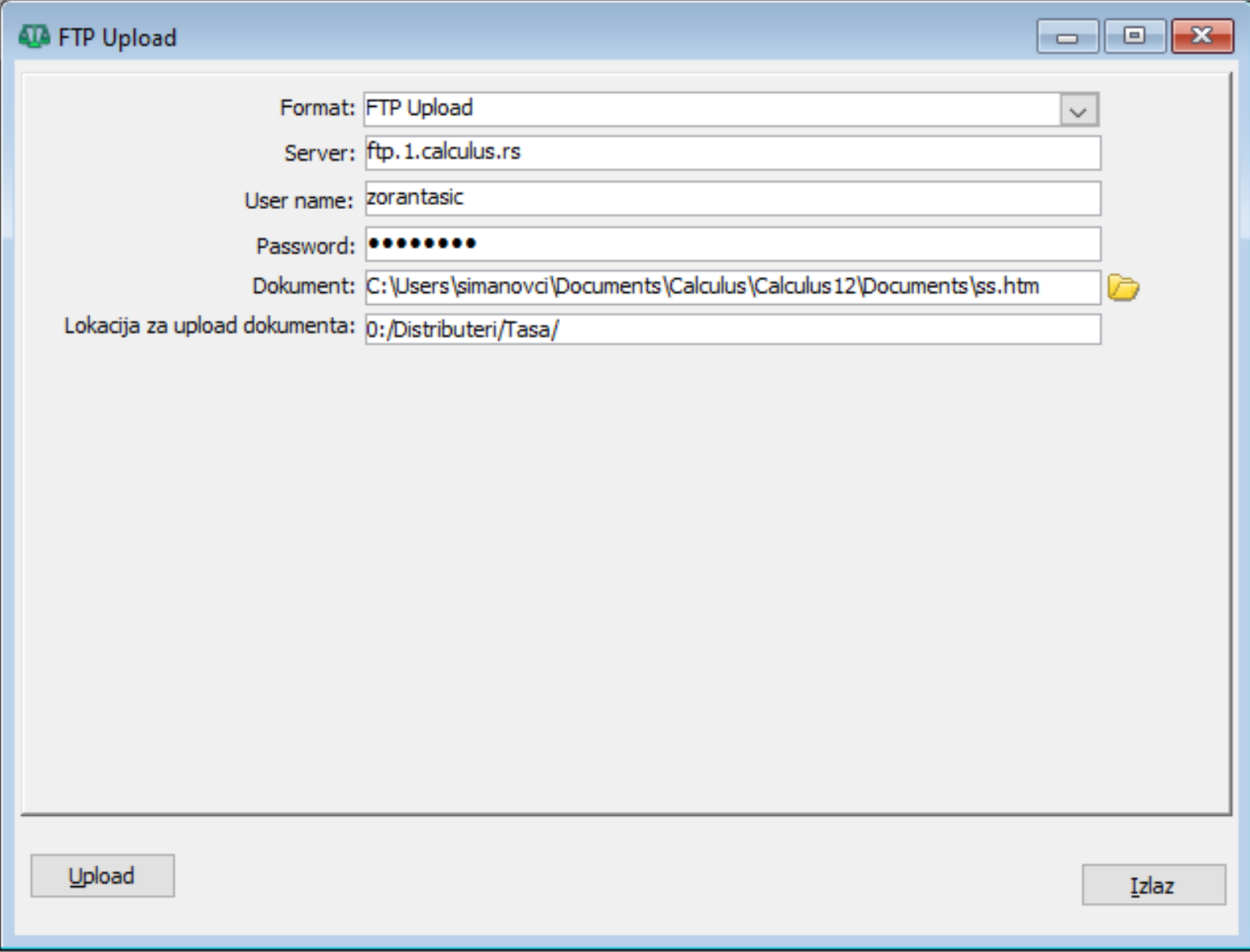 FTP ili File Transfer Protocol je standardni mrežni protokol koji se koristi za premeštanje fajlova. Prozor "FTP upload" putem kojeg Calculus12 ostvaruje FTP konekciju otvarate iz glavnog menija "Dokumenti → FTP upload".