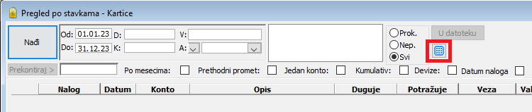 u filteru, vidi sliku:I u pregledu "Pregled po stavkama – kartice" u glavnoj knjizi možete filtrirati preglede prema unetim raspodelama troškova dugmetom