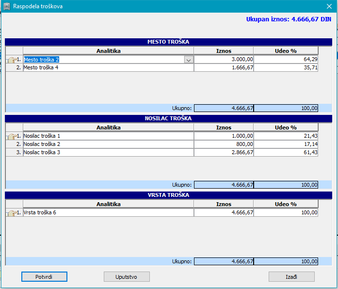 Za svaku od kategorija raspodele (vrste analitike) prikazan je poseban panel. Ubacivanjem novog zapisa u pojedinom panelu, iznos i procentualni udeo se iniciraju preostalim iznosom do ukupnog iznosa. Potrebno je izabrati analitiku i zatim po potrebi korigovati iznos ili udeo. Izmenom iznosa preračunava se udeo i obrnuto. Nije predviđena nikakva korelacija između pojedinih kategorija raspodele troškova. Npr. nije predviđeno povezivanje pojedinih nosilaca troška sa pojedinim mestima troška i sl, pa se i iznosi raspodele unose nezavisno za svaku kategoriju.