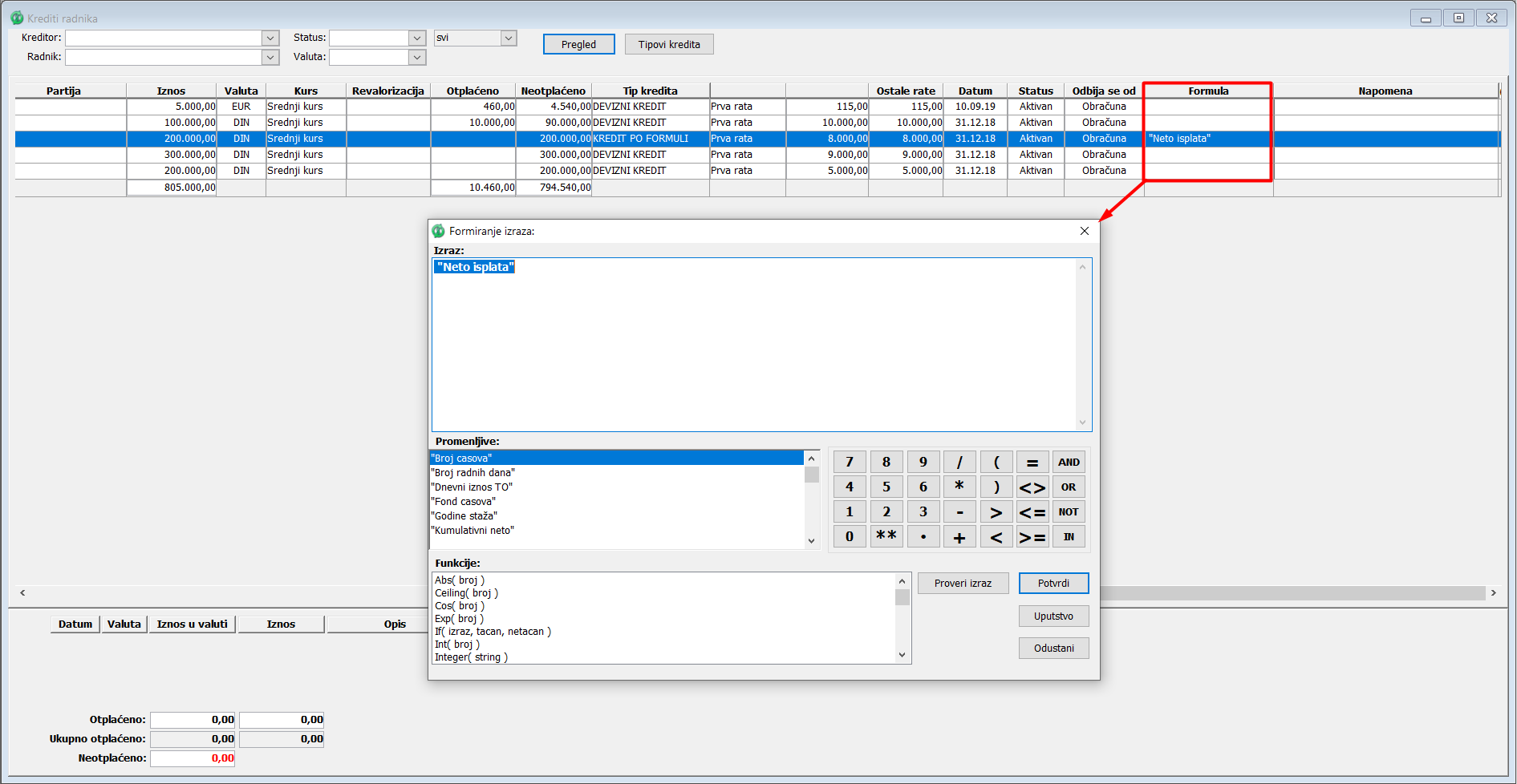 Evidencija kredita po formuli