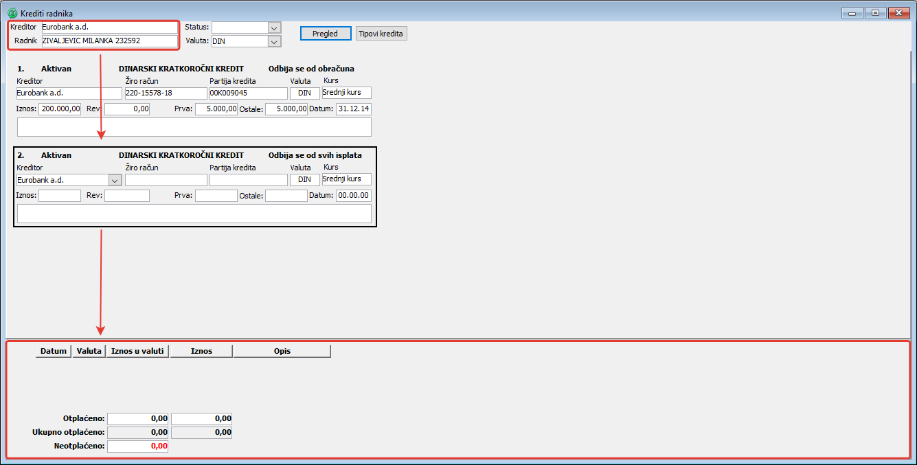 Opciono treba uneti i valutu u kojoj je odobren kredit (DIN, EUR...). Klikom na dugme "Pregled" biće izlistani svi do tada odobreni krediti zaposlenom ili ukoliko nije koristio kredite, ovaj prozor će biti prazan.