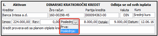 Kliknite na sledeće polje da unesete "Tip kredita" i izaberite jednu od ponuđenih vrednosti ( vidi sliku )