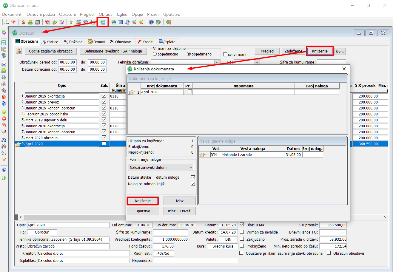 Selektujte obračun koji želite da knjižite u finansijsko knjigovodstvo klikom na dugme Knjiženje