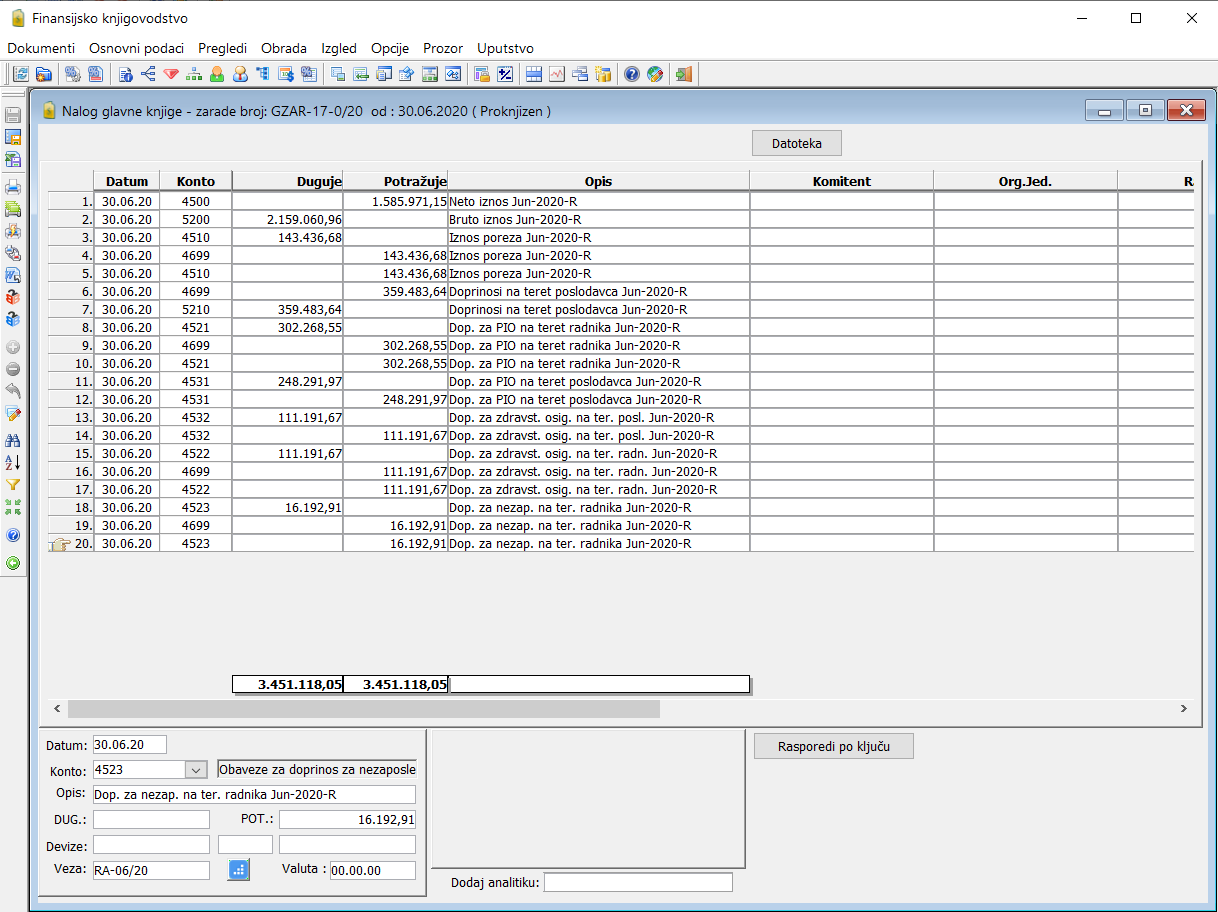 Nakon što je program kreirao nalog i dodelio mu broj glavnoj knjizi, možete pokrenuti program "Finansijsko knjigovodstvo" i proveriti kako je formiran nalog za knjiženje.