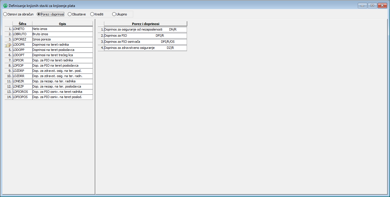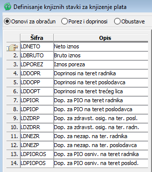 Prozor "Definisanje knjižnih stavki za knjiženje zarada" se koristi za definisanje šifara i opisa knjižnih stavki za knjiženje zarada radnika. Za svaku od navedenih knjižnih stavki se unose njeni činioci koji se odnose na: osnove za obračun, poreze i doprinose, obustave, kredite