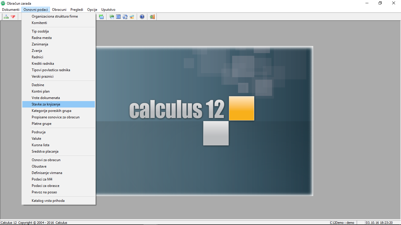 Da otvorite prozor "Definisanje knjižnih stavki za knjiženje zarada" u glavnom meniju programa "Obračun zarada" odaberite stavku "Osnovni podaci - Stavke za knjiženje" ( vidi sliku )