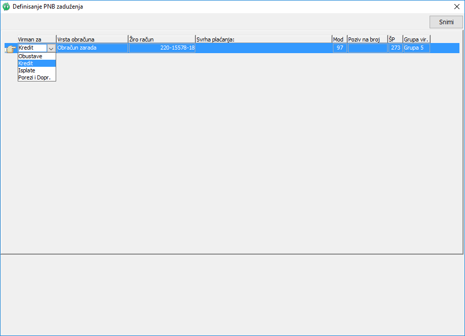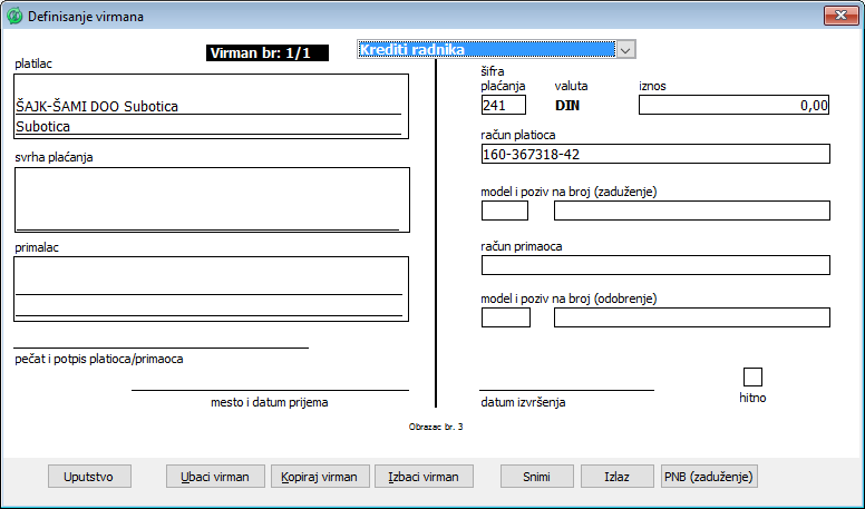 Klikom na dugme "Ubaci virman" kreirate virman za kredite radnika. Program automatski popunjava žiro račun nalogodavca. U polje "Šifra plaćanja" unesite šifru "241 - obustave po osnovu administrativne zabrane za kredite". Polje "Model" se ne popunjava. Polje "Poziv na broj" se takođe ne popunjava jer se podatak preuzima iz polja za partiju kredita - "Partija".