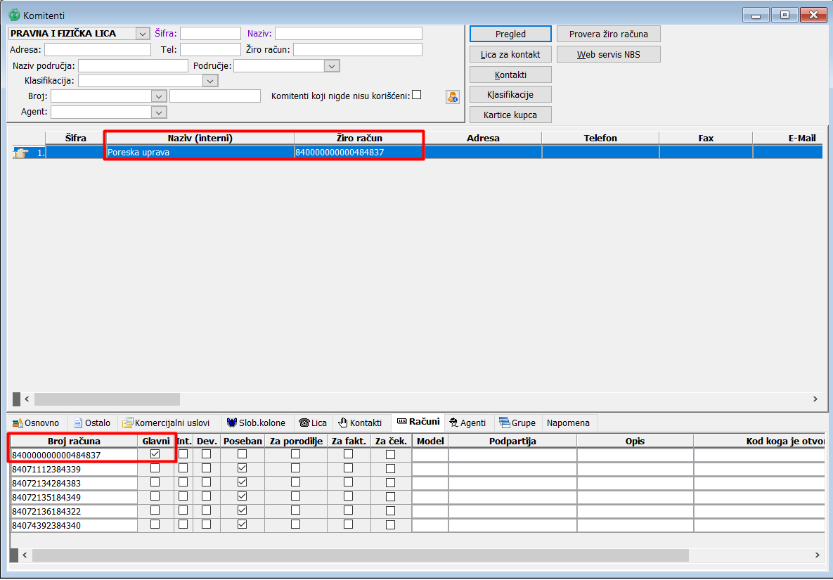 Da biste kreirali virman za isplatu objedinjenih poreza i doprinosa na zarade, potrebno je prvo definisati uplatni račun za objedinjenu naplatu. U komitentima za komitenta "Poreska uprava" unesite račun objedinjene naplate u listić "Računi", ( vidi sliku )