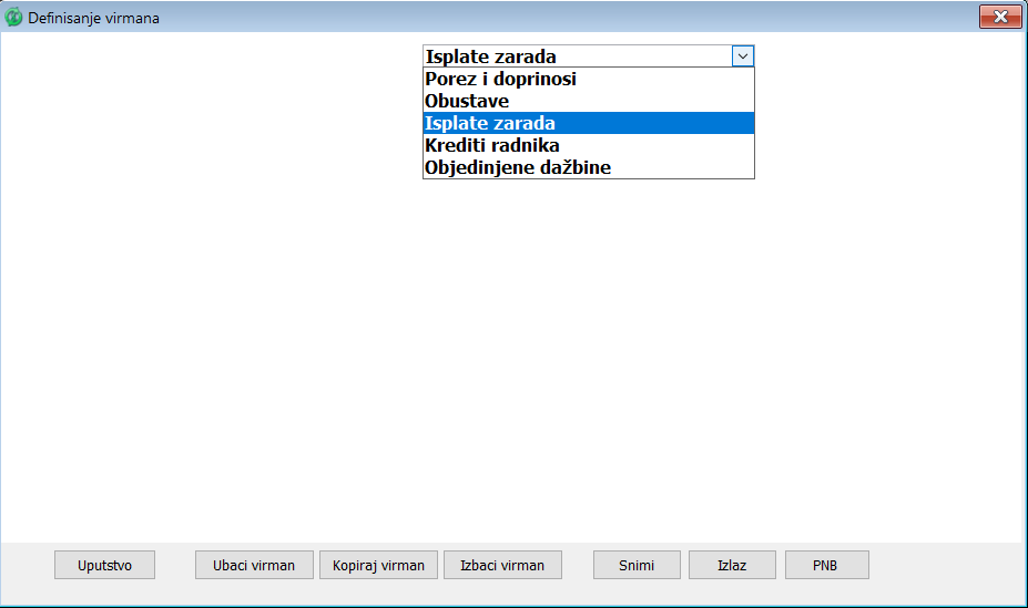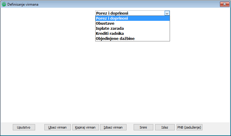 Ponuđene grupe virmana su: Porezi i doprinosi; Obustave; Isplate zarada; Krediti radnika; Objedinjene dažbine.