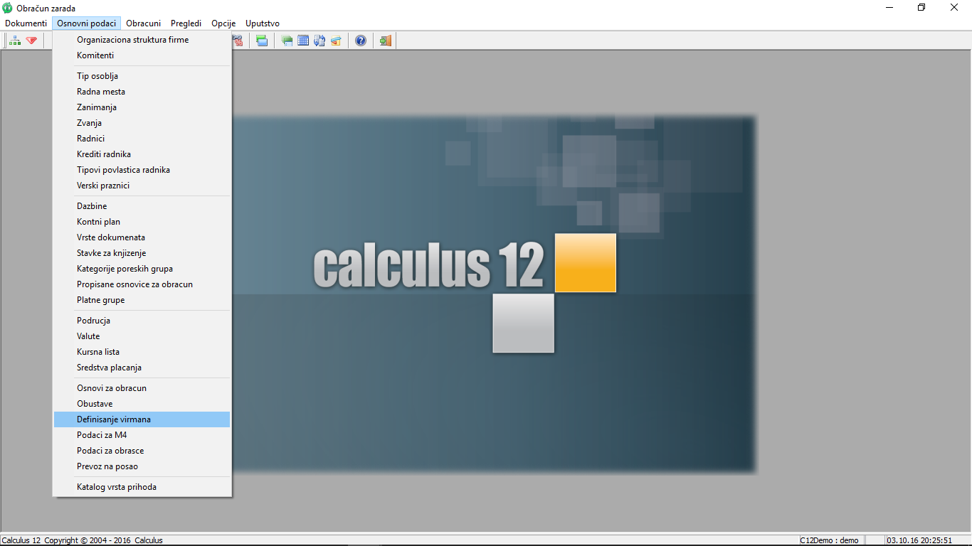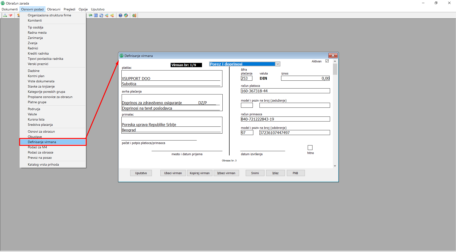 Da otvorite prozor "Definisanje virmana" u glavnom meniju programa "Obračun zarada" odaberite stavku "Osnovni podaci - Definisanje virmana" ( vidi sliku )