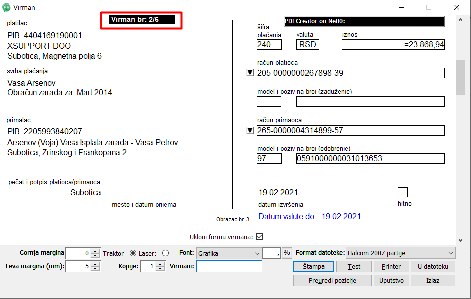 Zatim dugmetom "Ubaci virman" dodajete novi virman ili dugmetom "Kopiraj virman" kopirate podatke iz već popunjenog virmana u novi (prazan) virman. Popunjavate samo podatke koji su dozvoljeni za popunjavanje. Ostale podatke program preuzima iz aktuelnog obračuna zarade. Po završetku definisanja virmana kliknite na dugme "Snimi".