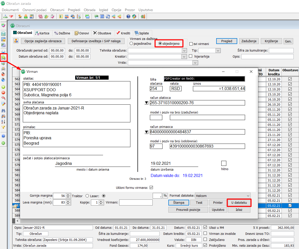 Pre generisanja virmana za štampanje ili slanje u e-banking klijent poslovne banke mora biti učitan potvrdni XML kao odgovor Poreske uprave. Potvrdni XML sadrži model 97 i BOP koji će biti učitani u virman. Virman za objedinjenu naplatu generišete iz prozora "Obračuni". Pre generisanja virmana za objedinjenu naplatu potrebno je da u sekciji "Virmani za dažbine" potvrdite radio polje "objedinjeno", ( vidi sliku )