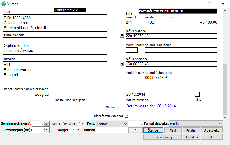 Klikom na dugme "Štampa" štampate virmane. Ukoliko preduzeće koristi usluge elektronskog bankarstva (E-banking), izaberite iz padajuće liste "Format datoteke:" format za export podataka Vaše banke i kliknite na dugme "U datoteku", dodelite fajl za export u prozoru "Izbor datoteke za eksportovanje podataka" i kliknite na dugme "Potvrdi". Kreirane fajlove zatim uvozite u e-banking klijent poslovne banke po uputstvu banke.