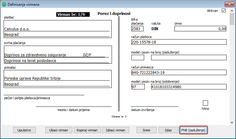 Ukoliko zbog objedinjenog plaćanja dažbina više ne koristite virmane za poreze i doprinose, ne morate ih obrisati već ih samo definišite kao neaktive isključivanjem polja za potvrdu "Aktivan".