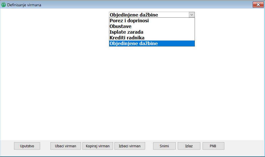 Otvorite prozor za definisanje virmana i iz padajuće liste za izbor grupa virmana selektujte stavku "Objedinjene dažbine" kako biste kreirali formu virmana za isplatu objedinjenih dažbina, ( vidi sliku )