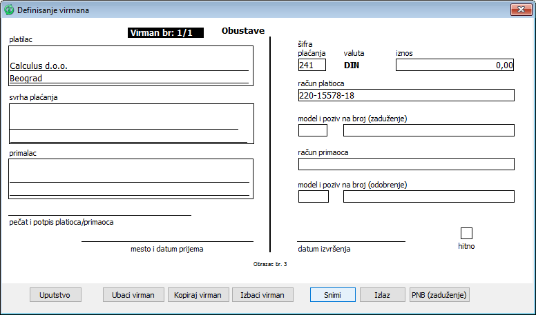 ili kliknite na ikonu osnovnog menija "Definisanje virmana"