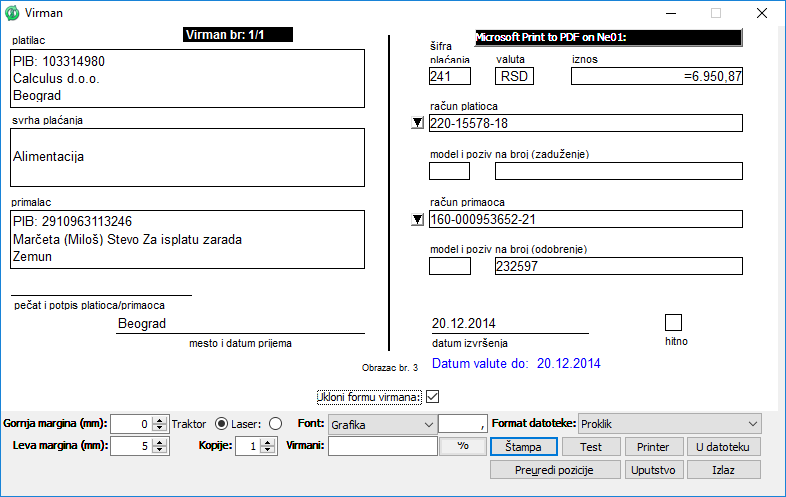 U ovom prozoru virmane definišete samo jednom. Tako definisane forme virmana program koristi kako bi automatski kreirao virmane za isplate zarada, dažbine, obustave i kredite. Virmani se posle definisanja više ne popunjavaju već ih program popunjava iz podataka koje preuzima iz konkretnog obračuna.