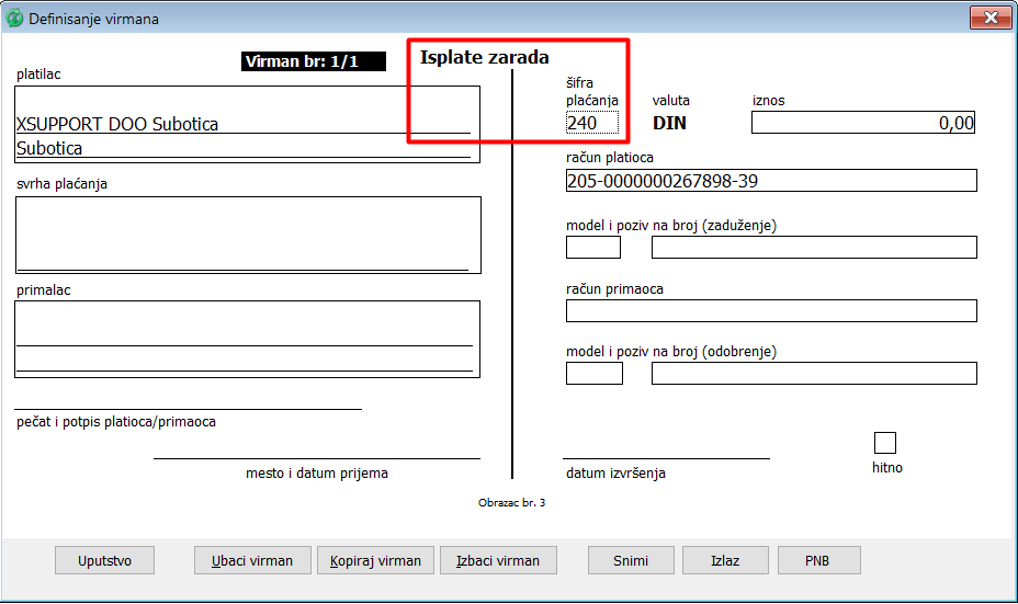 Obavezno unesite šifru plaćanja 254 važnu za transakciju raspodele. Takođe, ukoliko virman ne može da preuzme BOP neće moći da se izvrši uplata poreza i doprinosa koje je isplatilac prihoda dužan da obračuna, obustavi i uplati na propisani jedinstveni uplatni račun najkasnije na dan isplate prihoda fizičkom licu po odbitku.